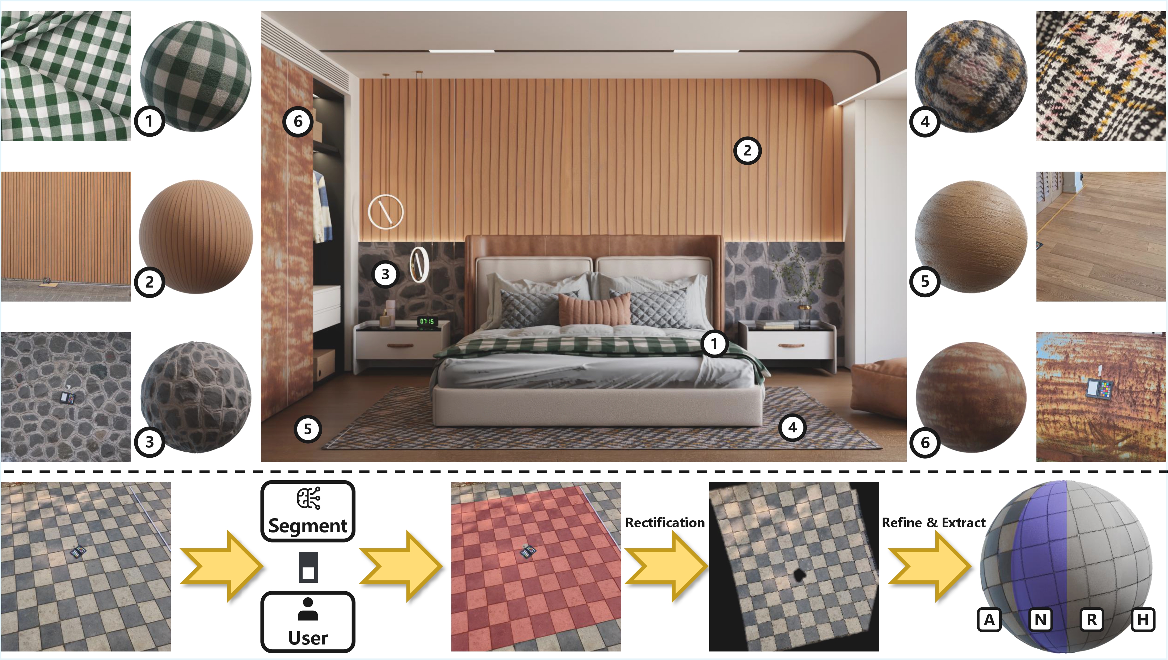 Qualitative results on real-world images. We present material extraction results from inputs captured by mobile devices in unconstrained environments.